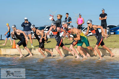 Race 2 starts with a 1.5km run, instead of running through the finish line athletes will then into transition where they will grab swim cap and googles ( most will run with them already on or down the tri suit ) where they will exit transition and head to swim start, athletes will have the option to either run in from the beach or dive from the pontoon they will swim the 300m course before exiting on the boat ramp and into transition for the 7km bike leg, once athletes have rack their bikes they must then run ( no shoes are required ) to the finish line located in front of the pavilion.